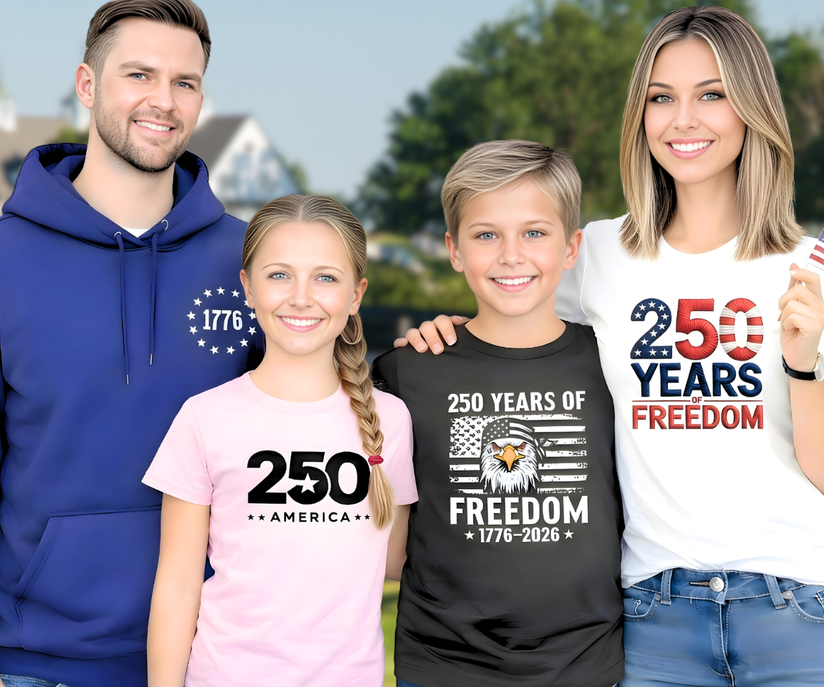 Celebrating 250 years of Faith. Family. Freedom. Patriotic apparel honoring America’s legacy 1776–2026.