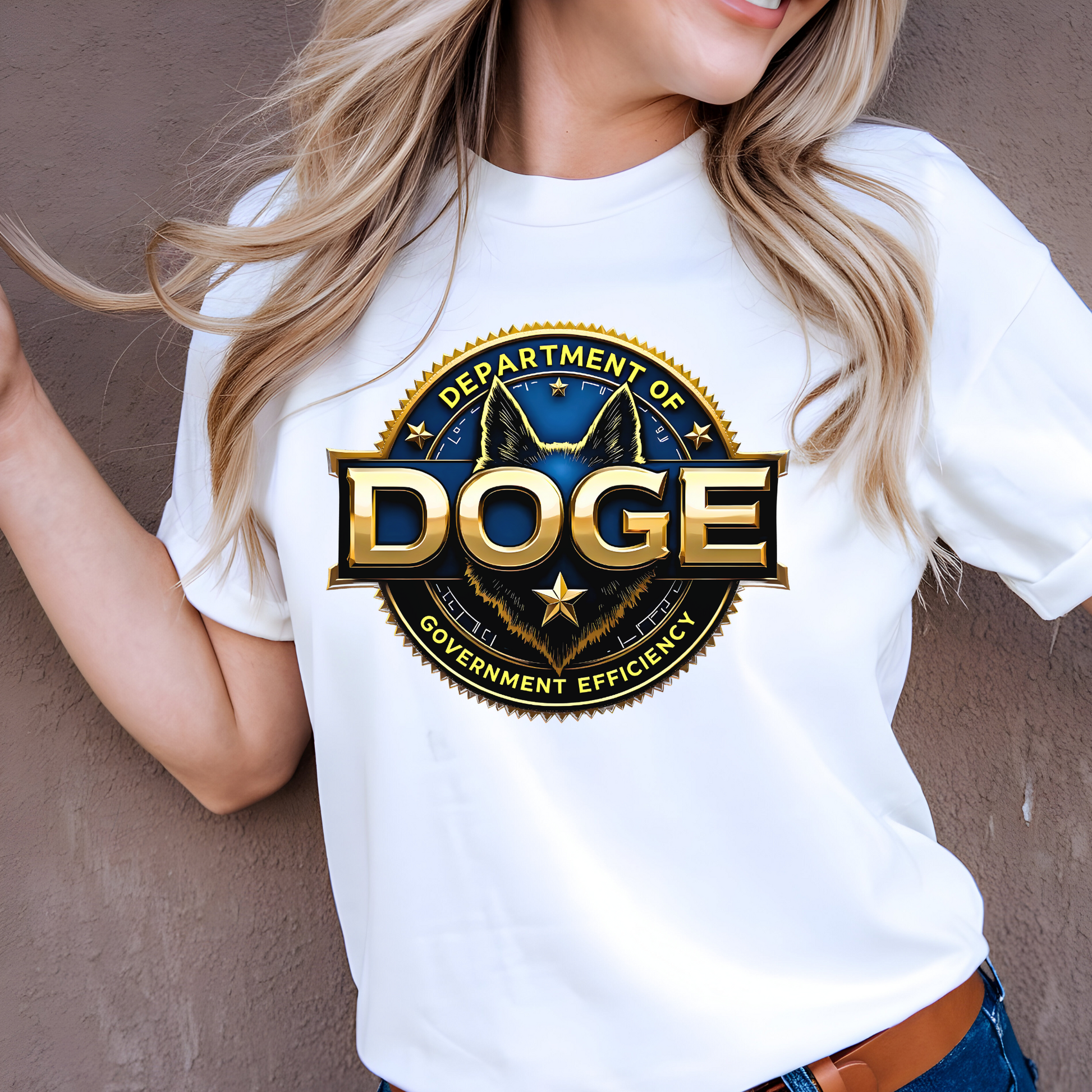 This DOGE graphic unisex t-shirt for women is a witty nod to freedom-lovers who know the government could use a little more... dog-like discipline. Featuring the bold Department of Government Efficiency (DOGE) seal in gold and blue, this unisex tee is designed for patriotic women who want to make a smart statement with serious style.